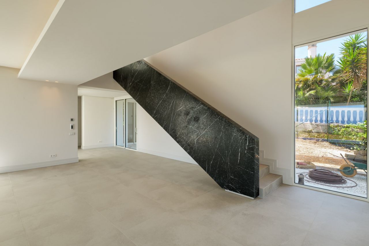 Spacious living area with high ceilings and fireplace, open plan fully fitted kitchen (Dica) with dining area. One guest bedroom en suite, multifunctional room (cinema, fitness, entertainment), guest toilet. Direct access from all rooms to the covered and open terraces, the lush gardens and an integrated heated pool.