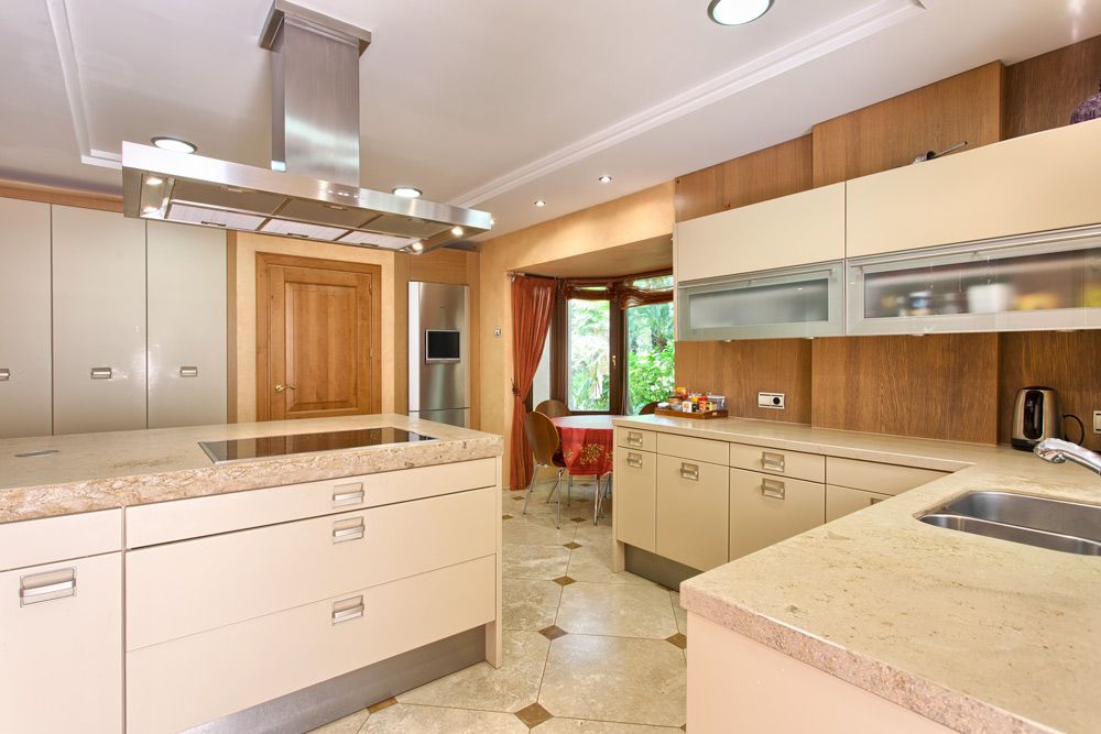 Living and dining area with high ceilings and direct access to the gardens, the pool area and a BBQ patio. Fully fitted kitchen.